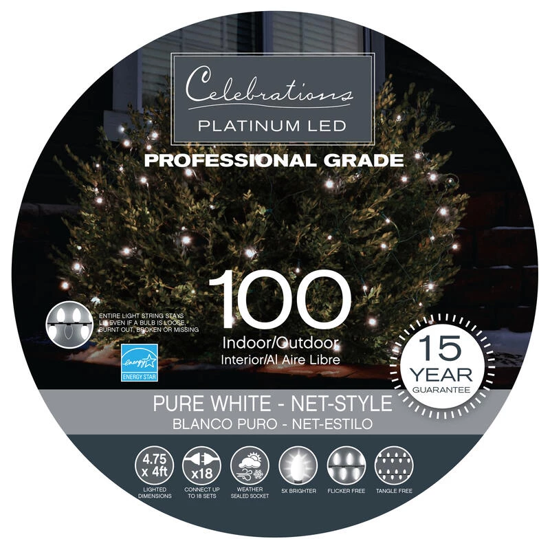 Our Net lights feature 150 lights on a 4’x6′ net, all mounted on heavy duty, 22 gauge wire. The 5′ jumper cord allows you to jump from bush to bush for all your lighting needs.