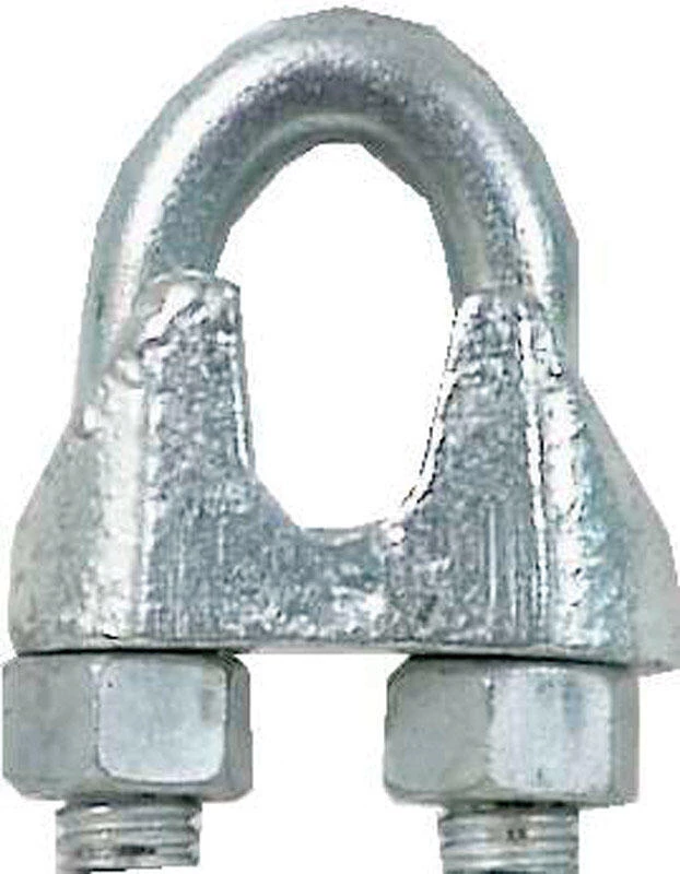 Wire Rope Clip is made from galvanized steel and has a 3/8 inch opening to insert the rope. Two hex nuts clamp rope tightly.