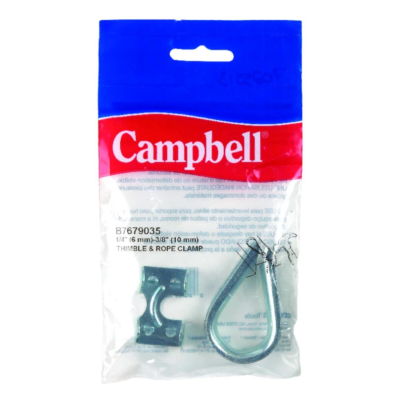 Zinc plated rope clamp with thimble. Used to create loop end termination on fiber rope.