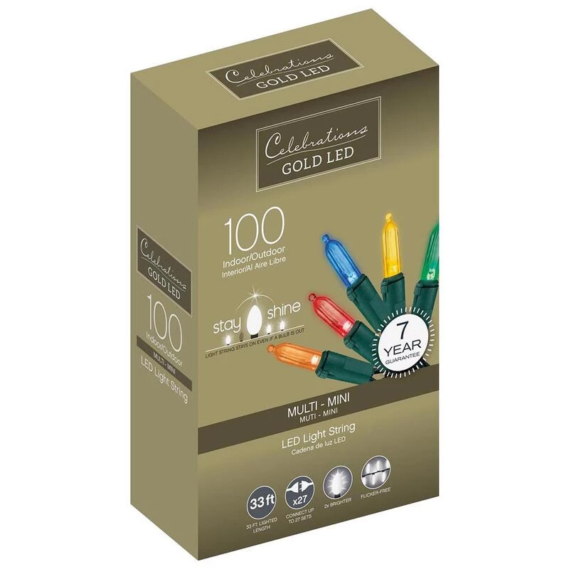 The Celebrations Gold LED brand brings you frustration free LED lighting with StayShine technology that ensure your light sets keep lighting up year after year. Check out the full assortment of all most popular bulb types in the three most popular colors. Celebrate the holiday season by lighting up your home with lights that are perfect for both inside and outside the home.
