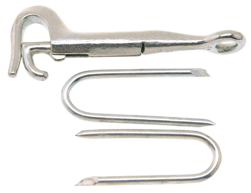 Four inch reverse eye gate hook with two steel staples.